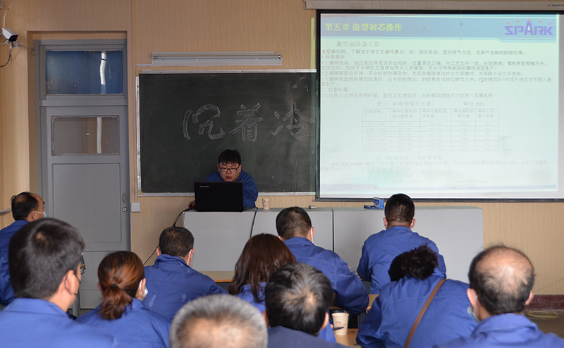 鑄造公司技術員趙耀鴻向參訓人員講解了造型工應當掌握的基礎知識、造型材料的性能、使用方法、造型工藝、制芯造型操作要領,以及鑄件缺陷產生的原因、預防措施等。