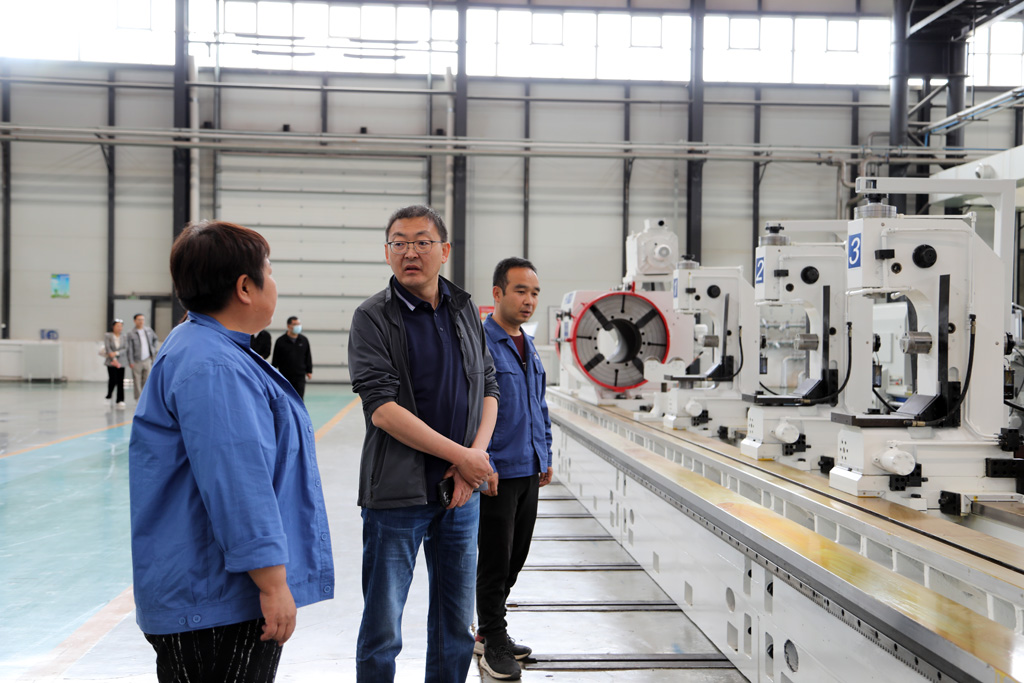 藺峰一行深入生產車間裝配現場,參觀生產場景和公司特色創新產品,在參觀調研中,展海瑜重點介紹了公司技術創新和發展經營等情況,對公司自主研發生產的高端數控纏繞機床、高精度大型數控軋輥磨床、大型五軸聯動機床、船舶用超大直徑筒體加工專用機床等各類產品的特點、用途、應用領域及市場前景做了詳細講解。并就目前產業政策、產業集群和產業協同發展等方面問題與藺峰一行作了深入交流。