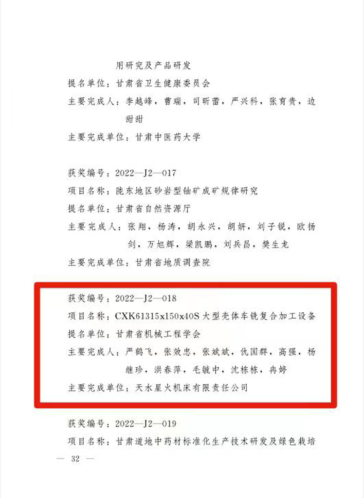 日前,甘肅省人民政府對在我省科學技術進步、經濟社會發展中作出突出貢獻的科學技術人員和組織進行了評審獎勵。由星火機床集團公司機床研究院科研人員嚴鶴飛、張效忠、張斌斌、仇國群、高強、楊繼珍、洪春萍、毛毓中、沈棟棟、冉婷研發的CXK61315x150x40S大型殼體車銑復合加工設備榮獲甘肅省科學技術進步獎二等獎。