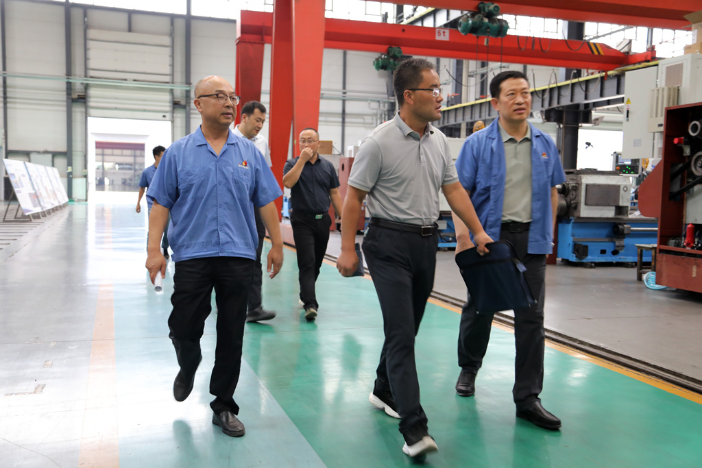 在工業園裝配車間現場,星火機床集團公司總經理劉勝陪同裴育棟一行參觀了生產現場并介紹了企業的生產經營,以及并購青重機床的情況。參觀結束后,裴育棟一行與公司領導劉勝、蔣俊等在銷售部會議室座談。