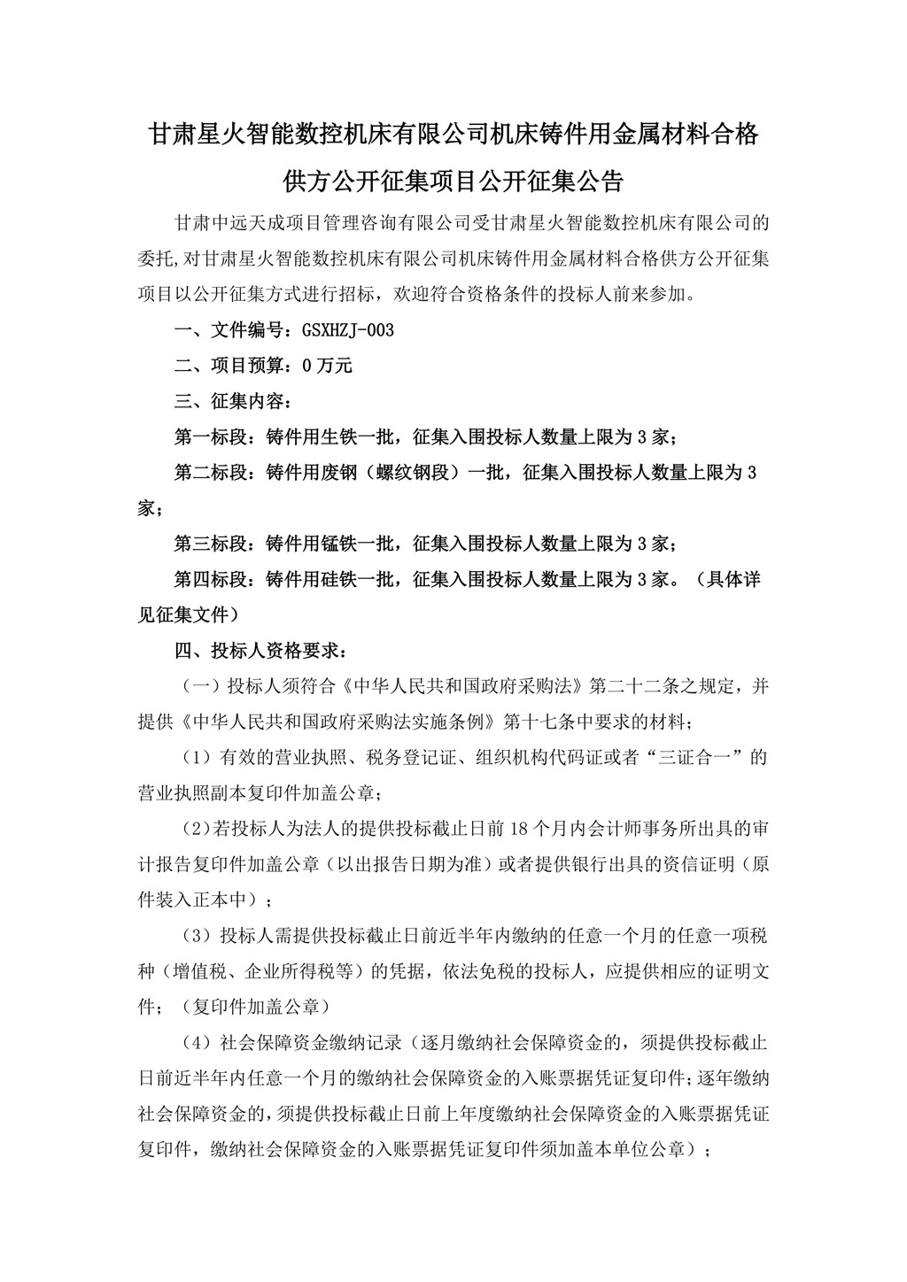 甘肅星火智能數(shù)控機(jī)床有限公司機(jī)床鑄件用金屬材料合格供方公開(kāi)征集項(xiàng)目公開(kāi)征集公告
