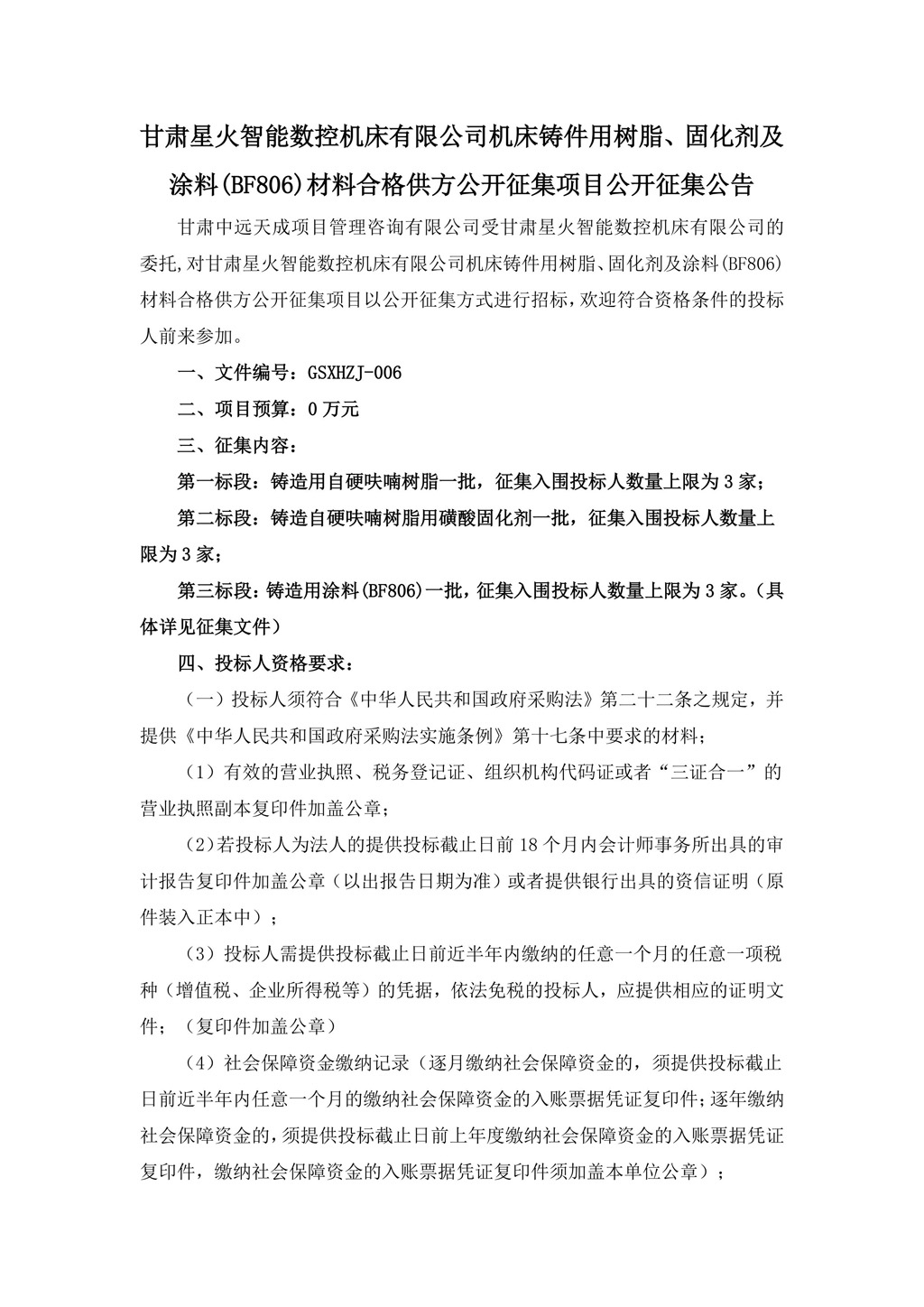 甘肅星火智能數控機床有限公司機床鑄件用樹脂、固化劑及涂料(BF806)材料合格供方公開征集項目公開征集公告