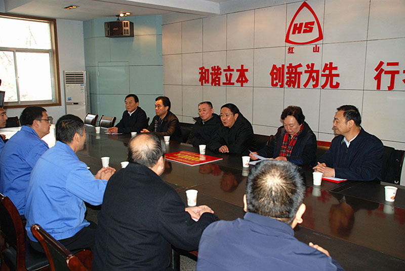 在紅山公司會議室,歐陽堅一行與星火機床集團公司、紅山公司領(lǐng)導(dǎo),勞模、先進個人、困難職工和職工代表座談。